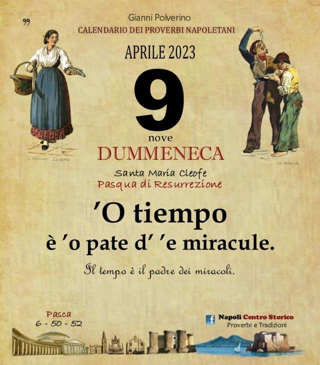 ‘O PRUVERBIO D’ ‘O JUORNO. Domenica 9 aprile 2023 09/04/2023 binews.it ATTUALITA', EVIDENZA, Il Proverbio del Giorno 0 di Gianni Polverino ‘O tiempo è ‘o pate d’ ‘e miracule Il tempo è il padre dei miracoli.