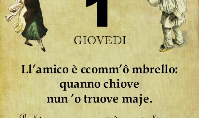 ‘O PRUVERBIO D’ ‘O JUORNO. Giovedì 1 Agosto 2019 01/08/2019 binews.it ATTUALITA', EVIDENZA, Il Proverbio del Giorno 0 di Gianni Polverino Ll’amico è ccomm’ô mbrello: quanno chiove nun ’o truove maje. Perchè spesso, nei momenti di maggior bisogno, l’amico ti viene meno.