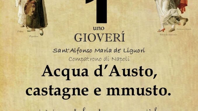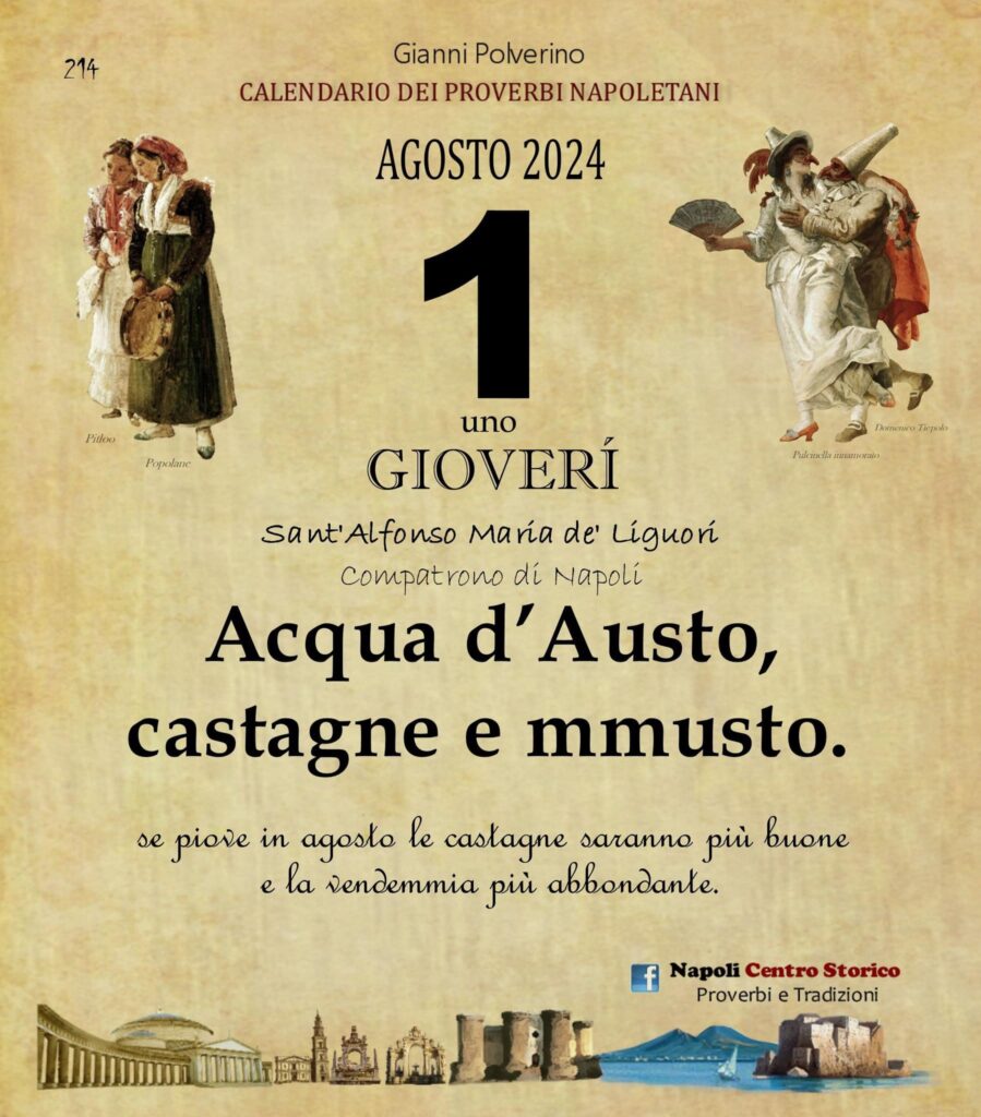 ‘O PRUVERBIO D’ ‘O JUORNO. Giovedì 1 agosto 2024 01/08/2024 binews.it ATTUALITA', EVIDENZA, Il Proverbio del Giorno 0 di Gianni Polverino Acqua d’Austo, castagne e mmusto. se piove in agosto le castagne saranno più buone e la vendemmia più abbondante.