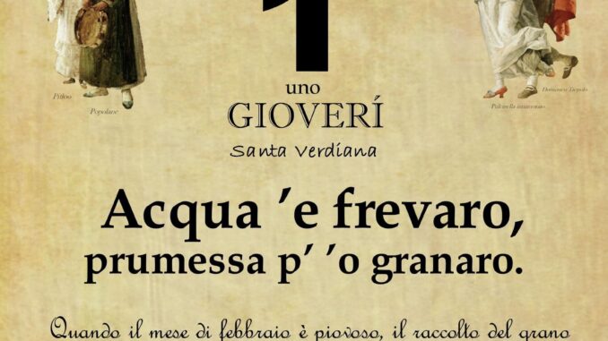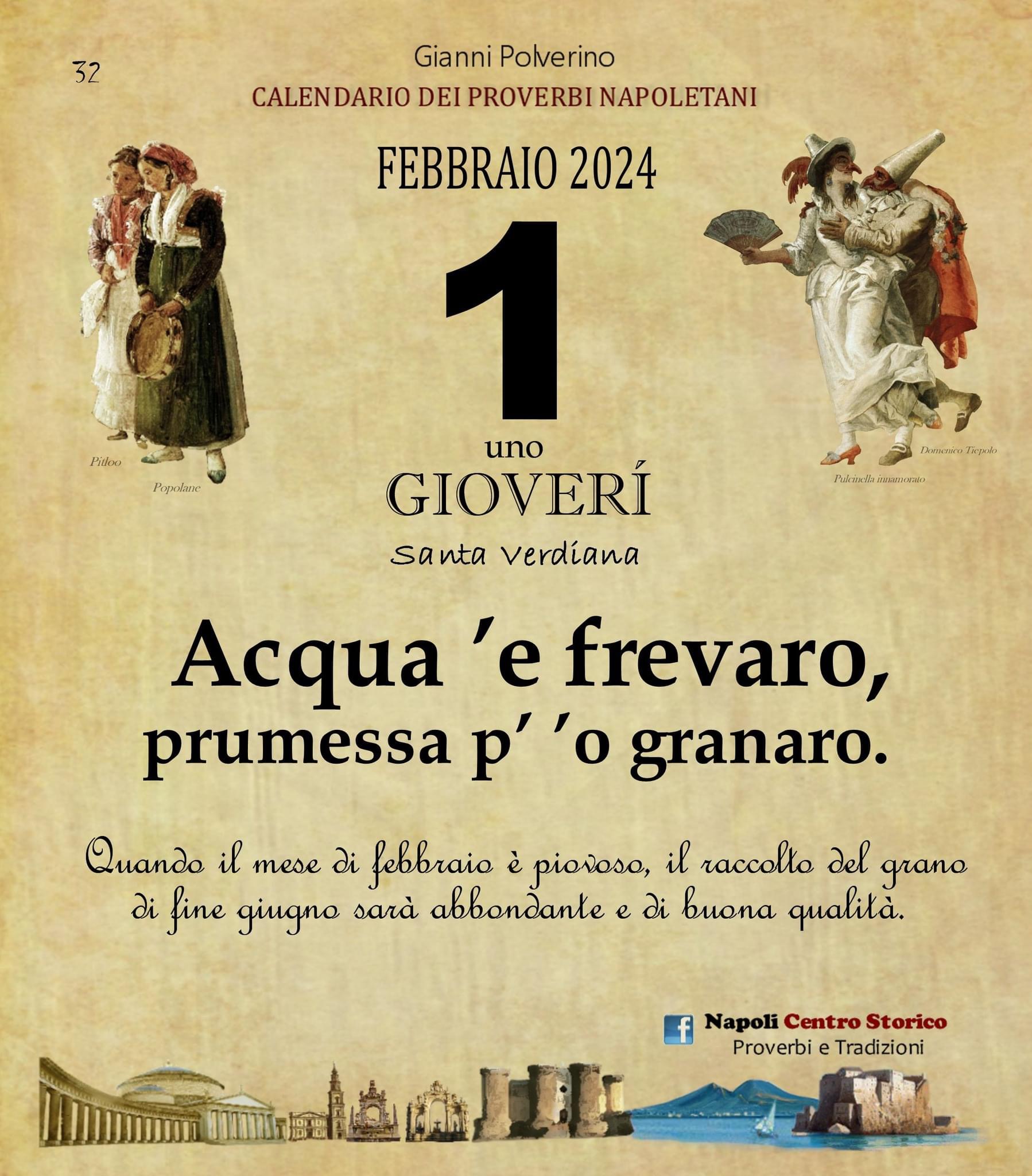 ‘O PRUVERBIO D’ ‘O JUORNO. Giovedì 1 febbraio 2024 01/02/2024 binews.it ATTUALITA', EVIDENZA, Il Proverbio del Giorno 0 di Gianni Polverino Acqua ’e frevaro, prumessa p’ ’o granaro. Quando il mese di febbraio è piovoso, il raccolto del grano di fine giugno sarà abbondante e di buona qualità.