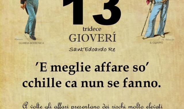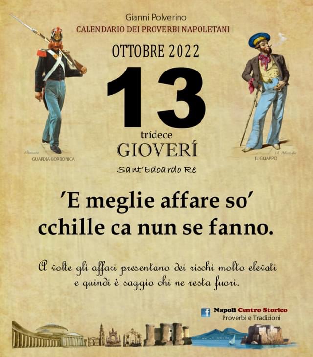 ‘O PRUVERBIO D’ ‘O JUORNO. Giovedì 13 ottobre 2022 13/10/2022 binews.it ATTUALITA', EVIDENZA, Il Proverbio del Giorno 0 di Gianni Polverino’E meglie affare so’ cchille ca nun se fanno. A volte gli affari presentano dei rischi molto elevati e quindi è saggio chi ne resta fuori.