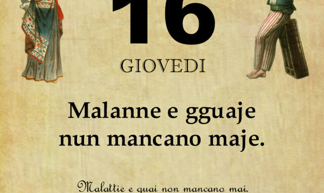 ‘O PRUVERBIO D’ ‘O JUORNO. Giovedì 16 luglio 2020 16/07/2020 binews.it ATTUALITA', EVIDENZA, Il Proverbio del Giorno 0 di Gianni Polverino Malanne e gguaje nun mancano maje. Malattie e guai non mancano mai.