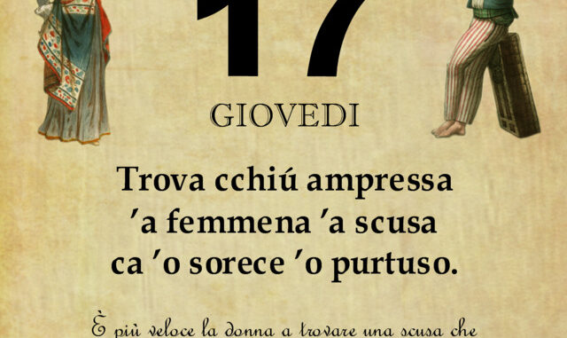 ‘O PRUVERBIO D’ ‘O JUORNO. Giovedì 17 settembre 2020 17/09/2020 binews.it ATTUALITA', EVIDENZA, Il Proverbio del Giorno 0 di Gianni Polverino Trova cchiù ampressa ’a femmena ’a scusa ca ’o sorece ’o purtuso. È più veloce la donna a trovare una scusa che un topo a trovare un buco.