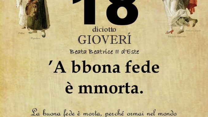 ‘O PRUVERBIO D’ ‘O JUORNO. Giovedì 18 gennaio 2024 18/01/2024 binews.it ATTUALITA', EVIDENZA, Il Proverbio del Giorno 0 di Gianni Polverino ’A bbona fede è mmorta. La buona fede è morta, perché ormai nel mondo vi sono solo finzioni e falsità.