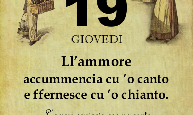 ‘O PRUVERBIO D’ ‘O JUORNO. Giovedì 19 luglio 2018 19/07/2018 binews.it ATTUALITA', EVIDENZA, Il Proverbio del Giorno 0 di Gianni Polverino Ll’ammore accummencia cu ’o canto e ffernesce cu ’o chianto. L’amore comincia con un canto e finisce con un pianto.