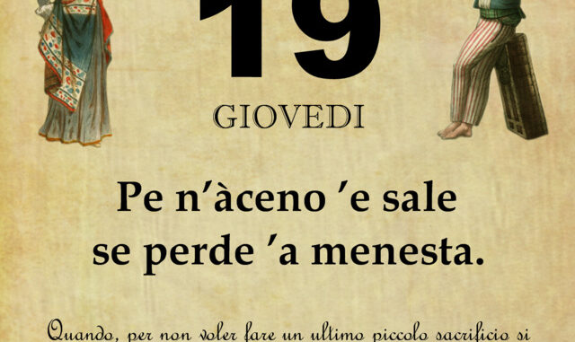 ‘O PRUVERBIO D’ ‘O JUORNO. Giovedì 19 Novembre 19/11/2020 binews.it ATTUALITA', EVIDENZA, Il Proverbio del Giorno 0 di Gianni Polverino Pe n’àceno ’e sale se perde ’a menesta. Quando, per non voler fare un ultimo piccolo sacrificio si manda a monte tutto il lavoro in precedenza fatto.
