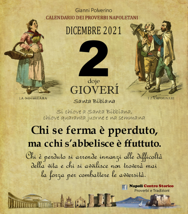 ‘O PRUVERBIO D’ ‘O JUORNO. Giovedì 2 dicembre 2021 02/12/2021 binews.it ATTUALITA', EVIDENZA, Il Proverbio del Giorno 0 di Gianni Polverino Chi se ferma è pperduto, ma cchi s’abbelisce è ffuttuto. Chi è perduto si arrende innanzi alle difficoltà della vita e chi si avvilisce non troverà mai la forza per combattere le avversità.