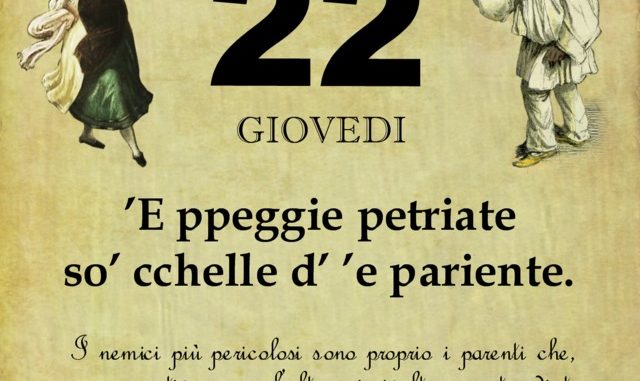 ‘O PRUVERBIO D’ ‘O JUORNO. Giovedì 22 agosto 2019 22/08/2019 binews.it ATTUALITA', EVIDENZA, Il Proverbio del Giorno 0 di Gianni Polverino ’E ppeggie petriate so’ cchelle d’ ’e pariente. I nemici più pericolosi sono proprio i parenti che, per un motivo o per l’altro, si rivoltono contro di te adoperando qualsiasi mezzo, pur di danneggiarti.