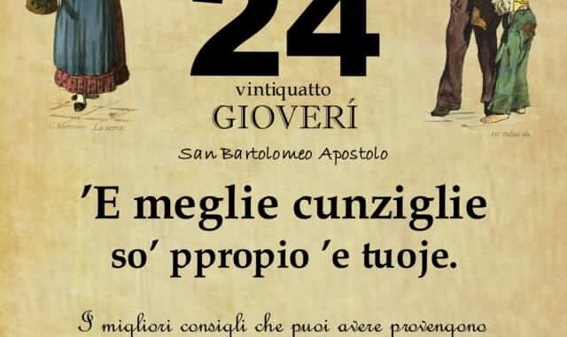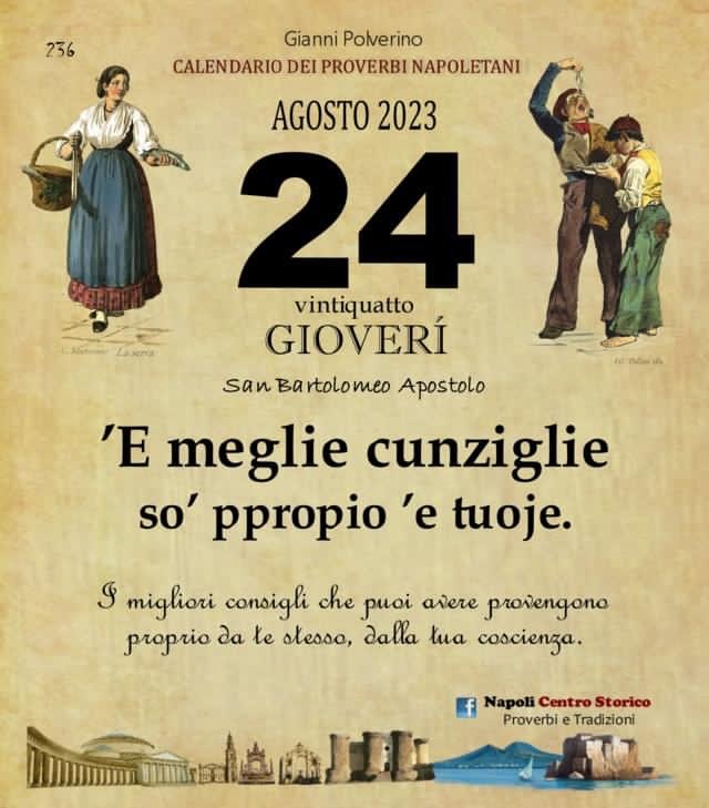 ‘O PRUVERBIO D’ ‘O JUORNO. Giovedì 24 agosto 2023 24/08/2023 binews.it ATTUALITA', EVIDENZA, Il Proverbio del Giorno 0 di Gianni Polverino ’E meglie cunziglie so’ ppropio ’e tuoje. I migliori consigli che puoi avere provengono proprio da te stesso, dalla tua coscienza.