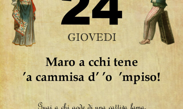 ‘O PRUVERBIO D’ ‘O JUORNO. Giovedì 24 settembre 2020 24/09/2020 binews.it ATTUALITA', EVIDENZA, Il Proverbio del Giorno 0 di Gianni Polverino Maro a cchi tene ’a cammisa d’ ’o ’mpiso! Guai a chi gode di una cattiva fama.