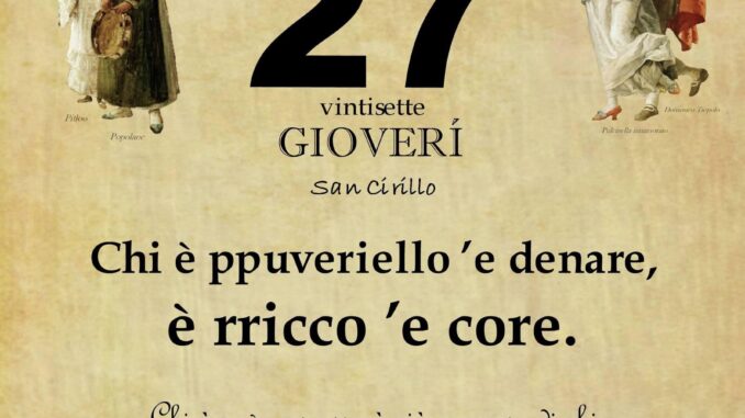 ‘O PRUVERBIO D’ ‘O JUORNO. Giovedì 27 giugno 2024 27/06/2024 binews.it ATTUALITA', EVIDENZA, Il Proverbio del Giorno 0 di Gianni Polverino Chi è ppuveriello ’e denare, è rricco ’e core. Chi è povero spesso è più generoso di chi vive nel benessere.