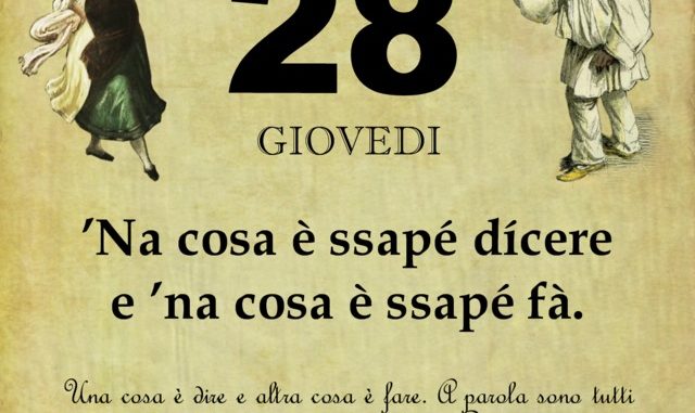 ‘O PRUVERBIO D’ ‘O JUORNO. Giovedì 28 marzo 2019 28/03/2019 binews.it ATTUALITA', EVIDENZA, Il Proverbio del Giorno 0 di Gianni Polverino ’Na cosa è ssapé dícere e ’na cosa è ssapé fà. Una cosa è dire e altra cosa è fare. A parola sono tutti bravi, ma il difficile è passare ai fatti. Riferito a quelle persone che fanno promesse che non saranno mantenute.