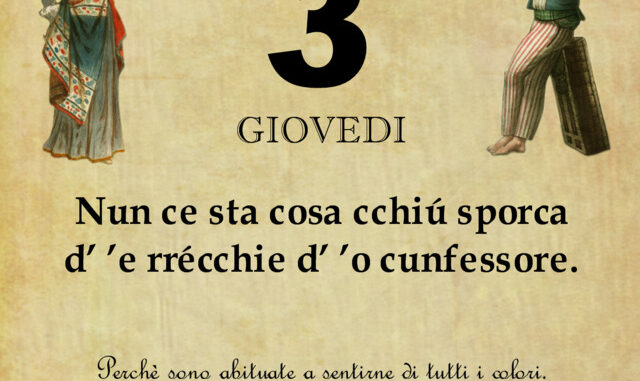 ‘O PRUVERBIO D’ ‘O JUORNO. Giovedì 3 settembre 2020 03/09/2020 binews.it ATTUALITA', EVIDENZA, Il Proverbio del Giorno 0 di Gianni Polverino Nun ce sta cosa cchiú sporca d’ ’e rrécchie d’ ’o cunfessore. Perchè sono abituate a sentirne di tutti i colori.