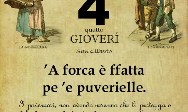 ‘O PRUVERBIO D’ ‘O JUORNO. Giovedì 4 febbraio 2021 04/02/2021 binews.it ATTUALITA', EVIDENZA, Il Proverbio del Giorno 0 di Gianni Polverino ’A forca è ffatta pe ’e puverielle. I poveracci, non avendo nessuno che li protegga o difenda, sono destinati ad avere sempre la peggio.