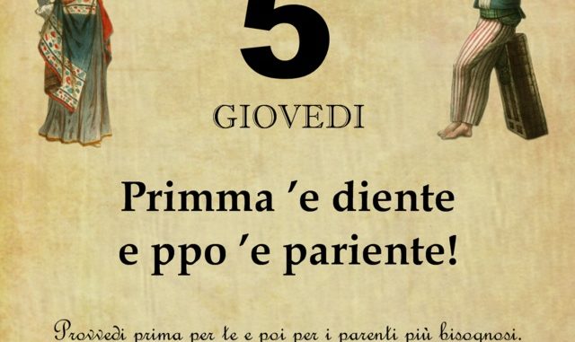 ‘O PRUVERBIO D’ ‘O JUORNO. Giovedì 5 marzo 2020 05/03/2020 binews.it ATTUALITA', EVIDENZA, Il Proverbio del Giorno 0 di Gianni Polverino Primma ’e diente e ppo ’e pariente! Provvedi prima per te e poi per i parenti più bisognosi.