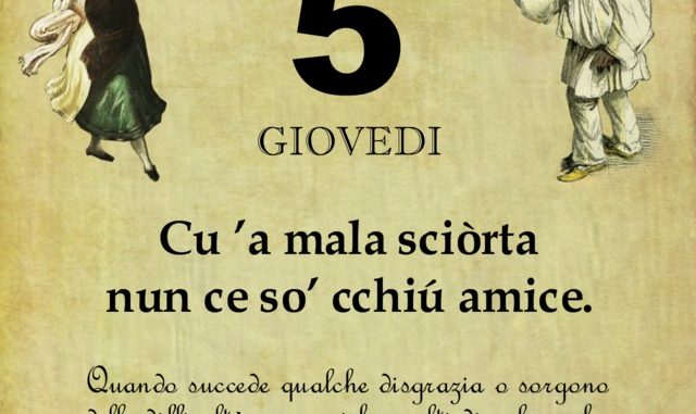 ‘O PRUVERBIO D’ ‘O JUORNO. Giovedì 5 settembre 2019 05/09/2019 binews.it ATTUALITA', EVIDENZA, Il Proverbio del Giorno 0 di Gianni Polverino Cu ’a mala sciòrta nun ce so’ cchiú amice. Quando succede qualche disgrazia o sorgono delle difficoltà economiche molti di coloro che si dichiaravano amici si defilano e scompaiono.