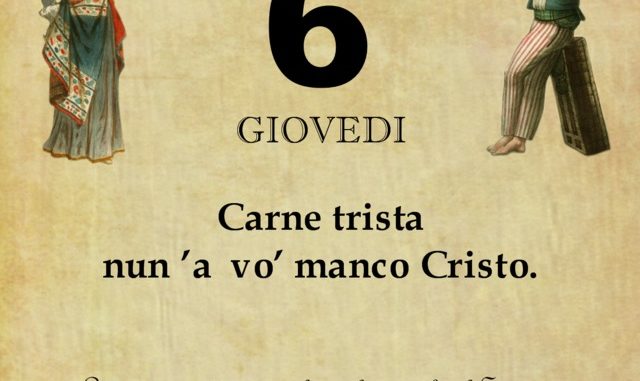 ‘O PRUVERBIO D’ ‘O JUORNO. Giovedì 6 febbraio 2020 06/02/2020 binews.it ATTUALITA', EVIDENZA, Il Proverbio del Giorno 0 di Gianni Polverino Carne trista nun ’a vo’ manco Cristo. Le persone cattive non le vuole neanche il Signore.