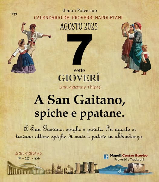 ‘O PRUVERBIO D’ ‘O JUORNO. Giovedì 7 agosto 2025 07/08/2025 binews.it ATTUALITA', EVIDENZA, Il Proverbio del Giorno 0 di Gianni PolverinoA San Gaitano, spiche e ppatane.A San Gaetano, spighe e patate. In agosto si trovano ottime spighe di mais e patate in abbondanza.