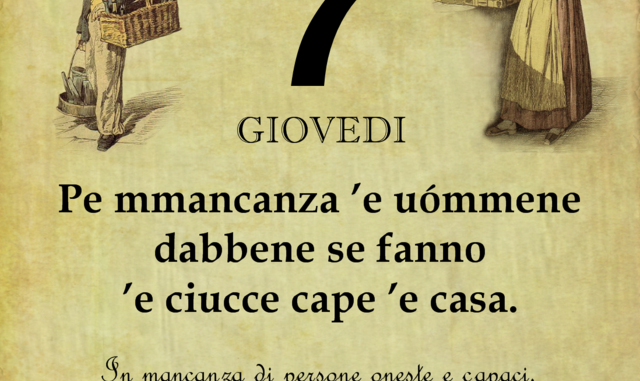 ‘O PRUVERBIO D’ ‘O JUORNO. Giovedì 7 giugno 2018 07/06/2018 binews.it ATTUALITA', EVIDENZA, Il Proverbio del Giorno 0 di Gianni Polverino Pe mmancanza ’e uómmene dabbene se fanno ’e ciucce cape ’e casa. In mancanza di persone oneste e capaci, i disonesti salgono al potere.4