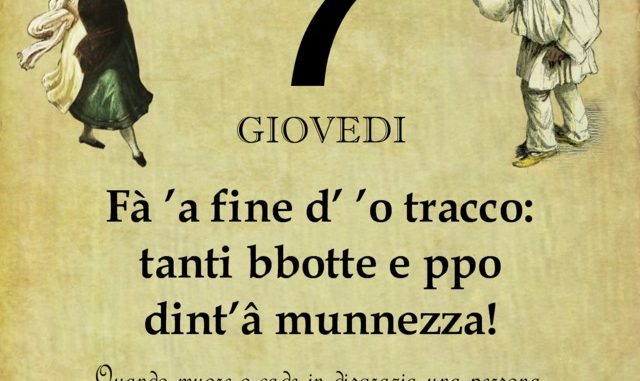 Fà ’a fine d’ ’o tracco: tanti bbotte e ppo dint’â munnezza! Quando muore o cade in disgrazia una persona molto autoritaria e dispotica non lascia alcun buon ricordo e cade subito nell’oblio.