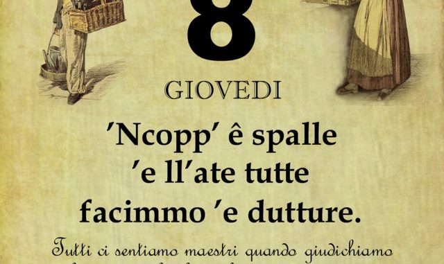‘O PRUVERBIO D’ ‘O JUORNO. Giovedì 8 novembre 2018 08/11/2018 binews.it ATTUALITA', EVIDENZA, Il Proverbio del Giorno 0 di Gianni Polverino ’Ncopp’ ê spalle ’e ll’ate tutte facimmo ’e dutture. Tutti ci sentiamo maestri quando giudichiamo