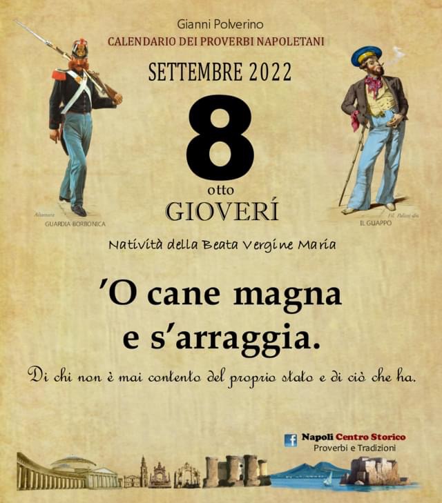 ‘O PRUVERBIO D’ ‘O JUORNO. Giovedì 8 settembre 2022 08/09/2022 binews.it ATTUALITA', EVIDENZA, Il Proverbio del Giorno 0 di Gianni Polverino ’O cane magna e s’arraggia. Di chi non è mai contento del proprio stato e di ciò che ha.