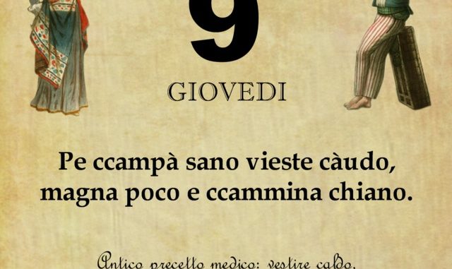‘O PRUVERBIO D’ ‘O JUORNO. Giovedì 9 aprile 2020 09/04/2020 binews.it ATTUALITA', EVIDENZA, Il Proverbio del Giorno 0 di Gianni Polverino Pe ccampà sano vieste càudo, magna poco e ccammina chiano. Antico precetto medico: vestire caldo, mangiar poco e camminare lentamente