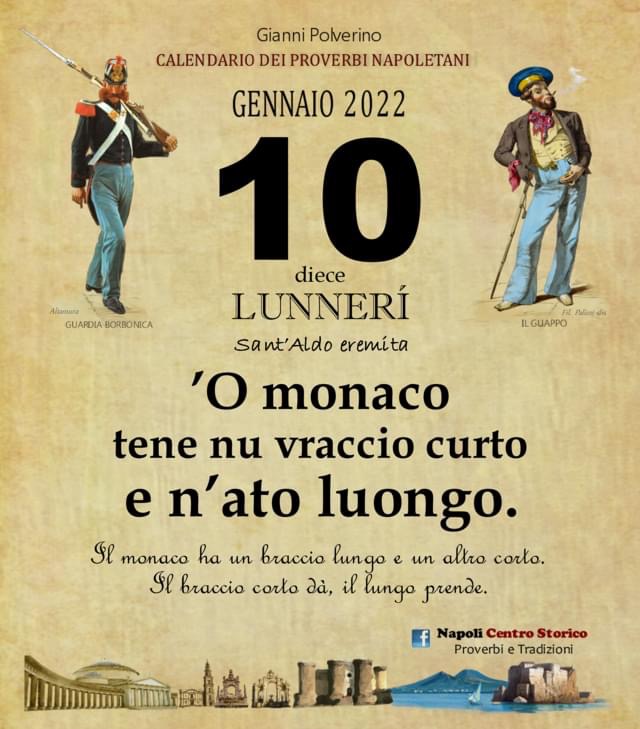 ‘O PRUVERBIO D’ ‘O JUORNO. Lunedì 10 gennaio 2021 10/01/2022 binews.it ATTUALITA', EVIDENZA, Il Proverbio del Giorno 0 di Gianni Polverino ’O monaco tene nu vraccio curto e n’ato luongo. Il monaco ha un braccio lungo e un altro corto. Il braccio corto dà, il lungo prende.