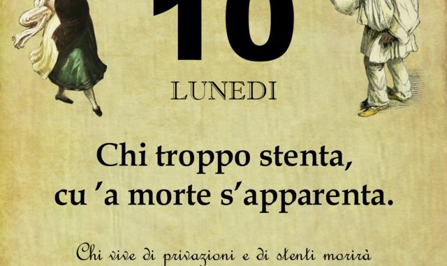‘O PRUVERBIO D’ ‘O JUORNO. Lunedì 10 giugno 2019 10/06/2019 binews.it ATTUALITA', EVIDENZA, Il Proverbio del Giorno 0 di Gianni Polverino Chi troppo stenta, cu ’a morte s’apparenta. Chi vive di privazioni e di stenti morirà certamente più presto degli altri.