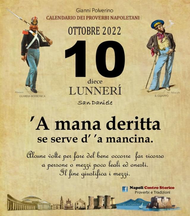 ‘O PRUVERBIO D’ ‘O JUORNO. Lunedì 10 ottobre 2022 10/10/2022 binews.it ATTUALITA', EVIDENZA, Il Proverbio del Giorno 0 di Gianni Polverino ’A mana deritta se serve d’ ’a mancina. Alcune volte per fare del bene occorre far ricorso a persone o mezzi poco leali ed onesti. Il fine giustifica i mezzi.