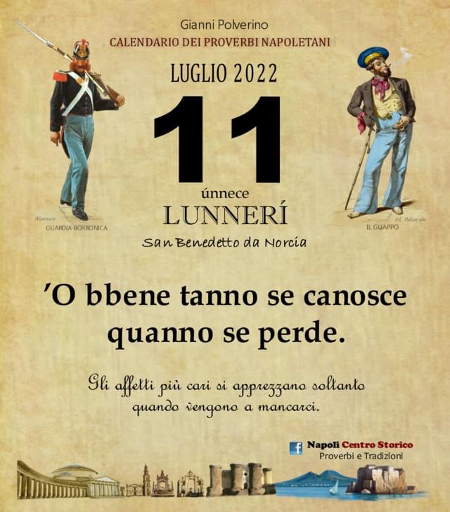 ‘O PRUVERBIO D’ ‘O JUORNO. Lunedì 11 luglio 2022 11/07/2022 binews.it ATTUALITA', EVIDENZA, Il Proverbio del Giorno 0 di Gianni Polverino ’O bbene tanno se canosce quanno se perde. Gli affetti più cari si apprezzano soltanto quando vengono a mancarci.