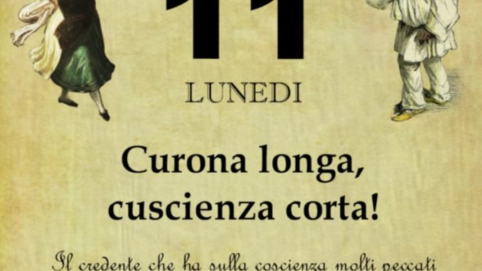 ‘O PRUVERBIO D’ ‘O JUORNO. Lunedì 11 novembre 2019 11/11/2019 binews.it ATTUALITA', EVIDENZA, Il Proverbio del Giorno 0 di Gianni Polverino Curona longa, cuscienza corta! Il credente che ha sulla coscienza molti peccati esagera nelle sue preghiere riparatrici, sperando di ottenere così il perdono divino.