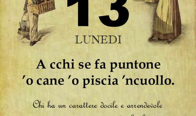 ‘O PRUVERBIO D’ ‘O JUORNO. Lunedì 13 agosto 2018 13/08/2018 binews.it ATTUALITA', EVIDENZA, Il Proverbio del Giorno 0 di Gianni Polverino A cchi se fa puntone ’o cane ’o piscia ’ncuollo. Chi ha un carattere docile e arrendevole sarà sempre sottomesso dagli altri.