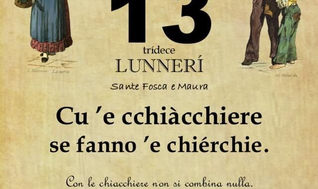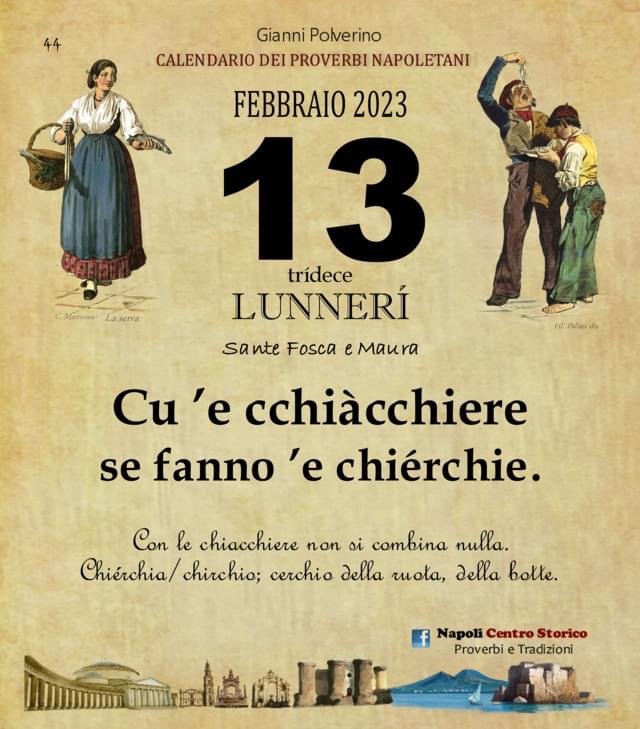 ‘O PRUVERBIO D’ ‘O JUORNO. Lunedì 13 febbraio 2023 13/02/2023 binews.it ATTUALITA', EVIDENZA, Il Proverbio del Giorno 0 di Gianni Polverino Cu ’e cchiàcchiere se fanno ’e chiérchie. Con le chiacchiere non si combina nulla. Chiérchia/chirchio; cerchio della ruota, della botte.