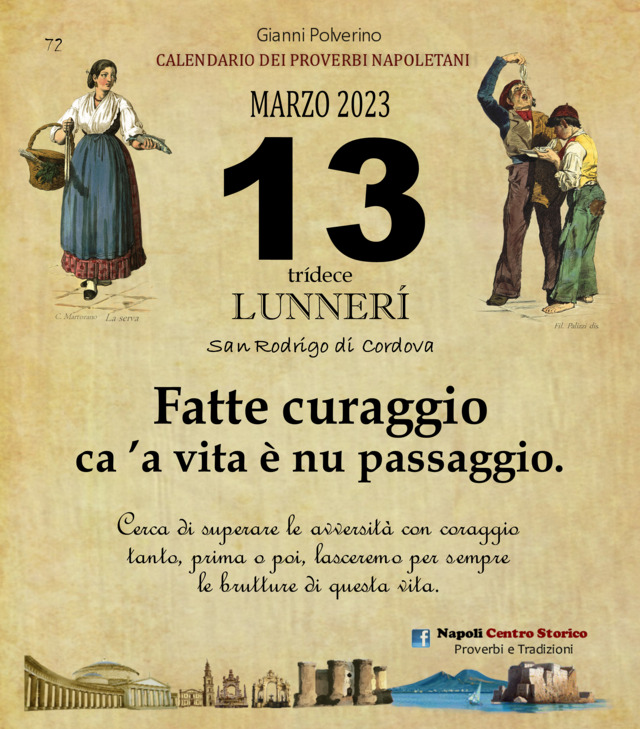 ‘O PRUVERBIO D’ ‘O JUORNO. Lunedì 13 marzo 2023 13/03/2023 binews.it ATTUALITA', EVIDENZA, Il Proverbio del Giorno 0 di Gianni Polverino Fatte curaggio ca ’a vita è nu passaggio. Cerca di superare le avversità con coraggio tanto, prima o poi, lasceremo per sempre le brutture di questa vita.