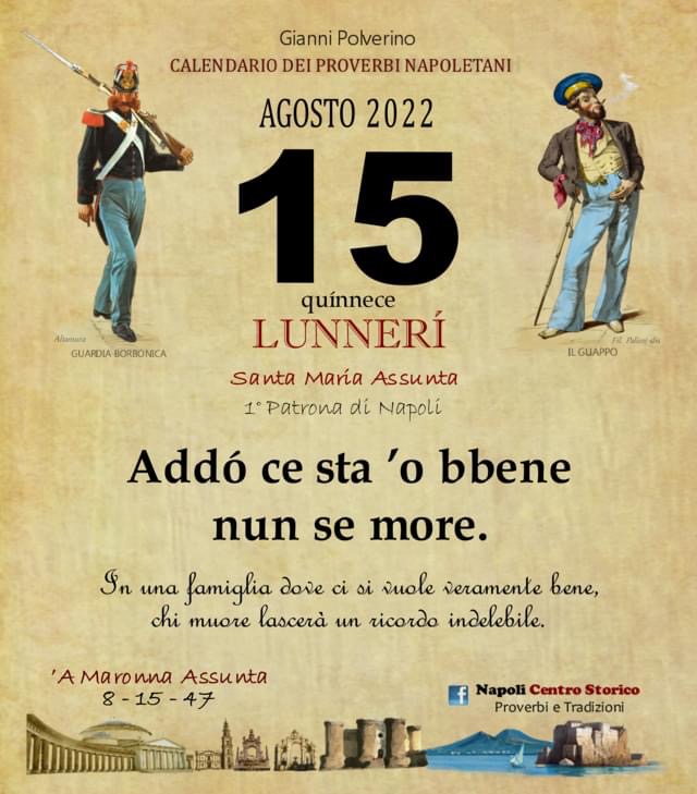 ‘O PRUVERBIO D’ ‘O JUORNO. Lunedì 15 agosto 2022 15/08/2022 binews.it ATTUALITA', EVIDENZA, Il Proverbio del Giorno 0 di Gianni Polverino Addó ce sta ’o bbene nun se more. In una famiglia dove ci si vuole veramente bene, chi muore lascerà un ricordo indelebile.