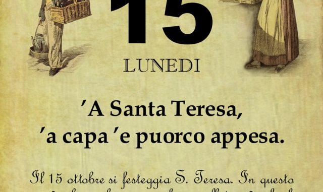 ’A Santa Teresa, ’a capa ’e puorco appesa. Il 15 ottobre si festeggia S. Teresa. In questo periodo il maiale viene anche macellato, ed è facile vedere la testa dell’animale nelle macellerie.