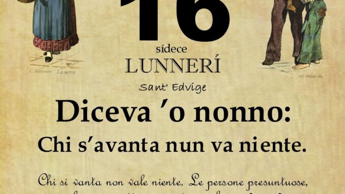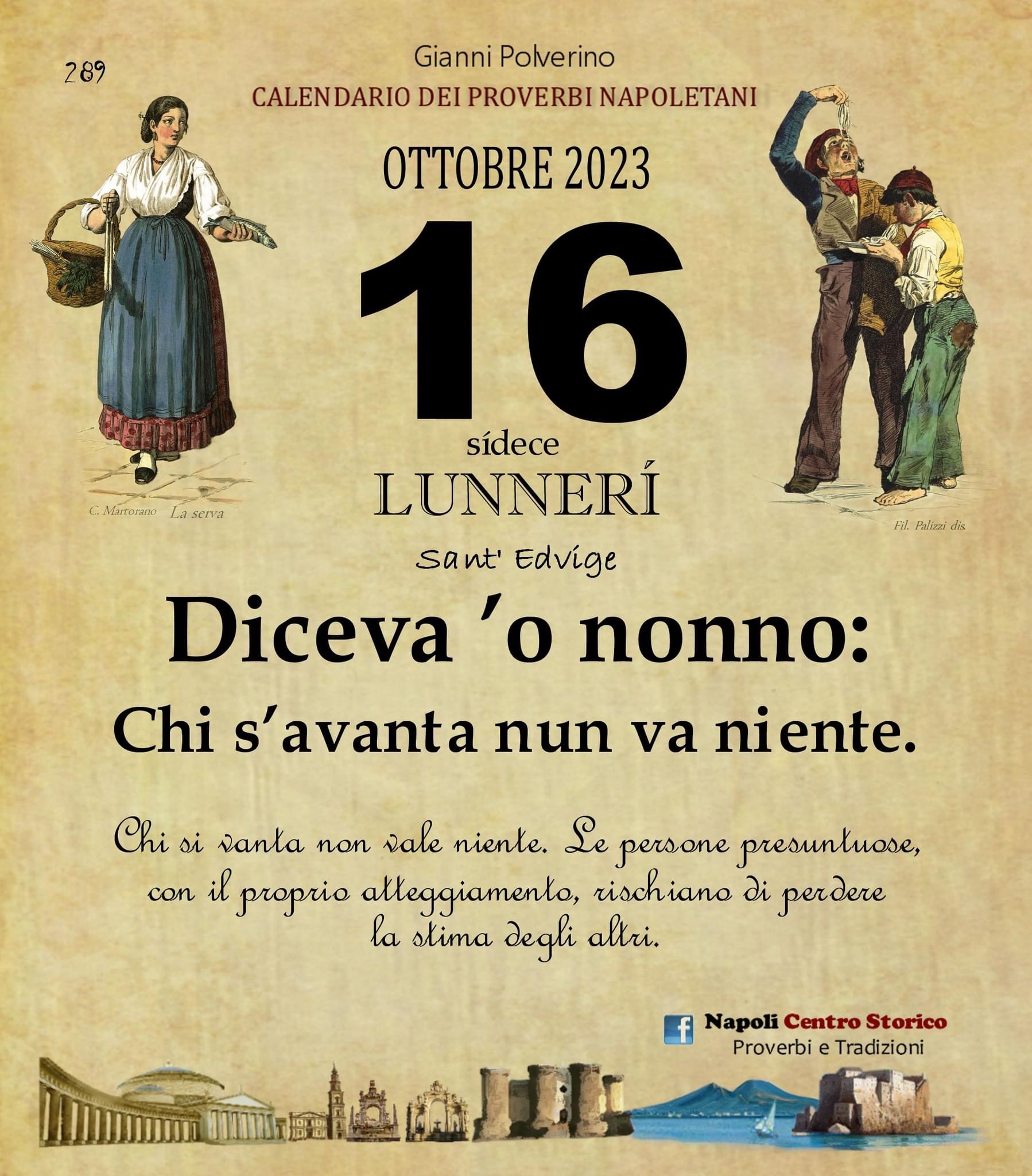 ‘O PRUVERBIO D’ ‘O JUORNO. Lunedì 16 ottobre 2023 16/10/2023 binews.it ATTUALITA', EVIDENZA, Il Proverbio del Giorno 0 di Gianni PolverinoDiceva ’o nonno: Chi s’avanta nun va niente. Chi si vanta non vale niente. Le persone presuntuose, con il proprio atteggiamento, rischiano di perdere la stima degli altri.