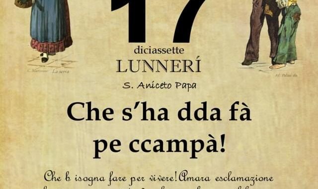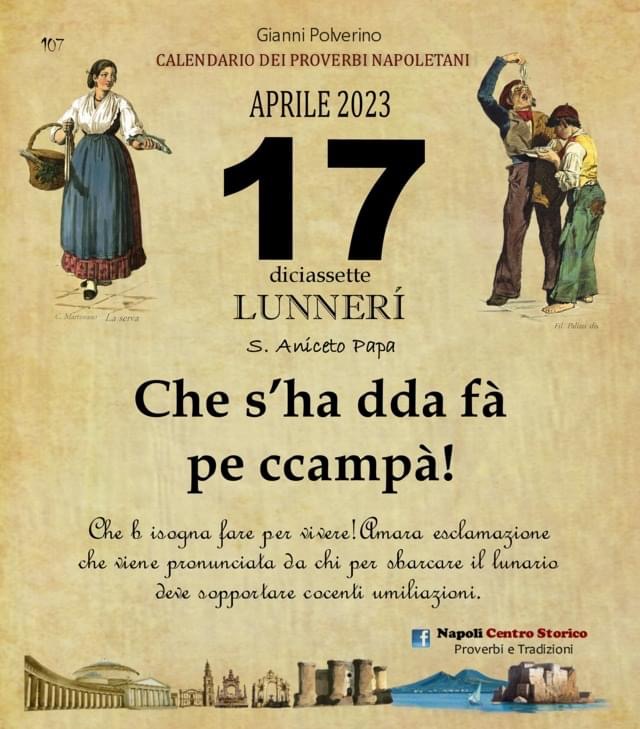 ‘O PRUVERBIO D’ ‘O JUORNO. Lunedì 17 aprile 2023 17/04/2023 binews.it ATTUALITA', EVIDENZA, Il Proverbio del Giorno 0 di Gianni Polverino Che s’ha dda fà pe ccampà! Che bisogna fare per vivere!Amara esclamazione che viene pronunciata da chi per sbarcare il lunario deve sopportare cocenti umiliazioni.