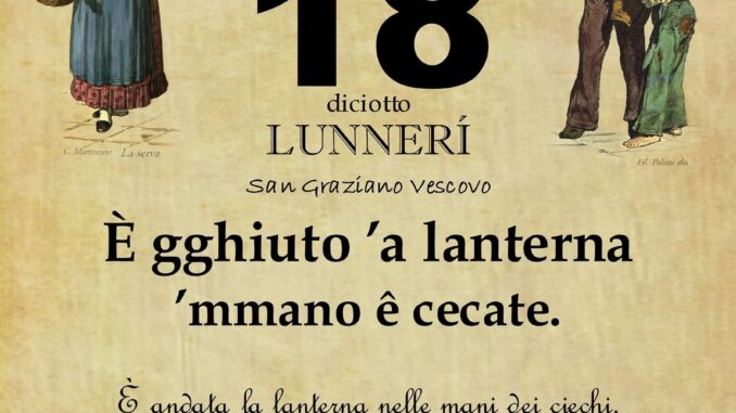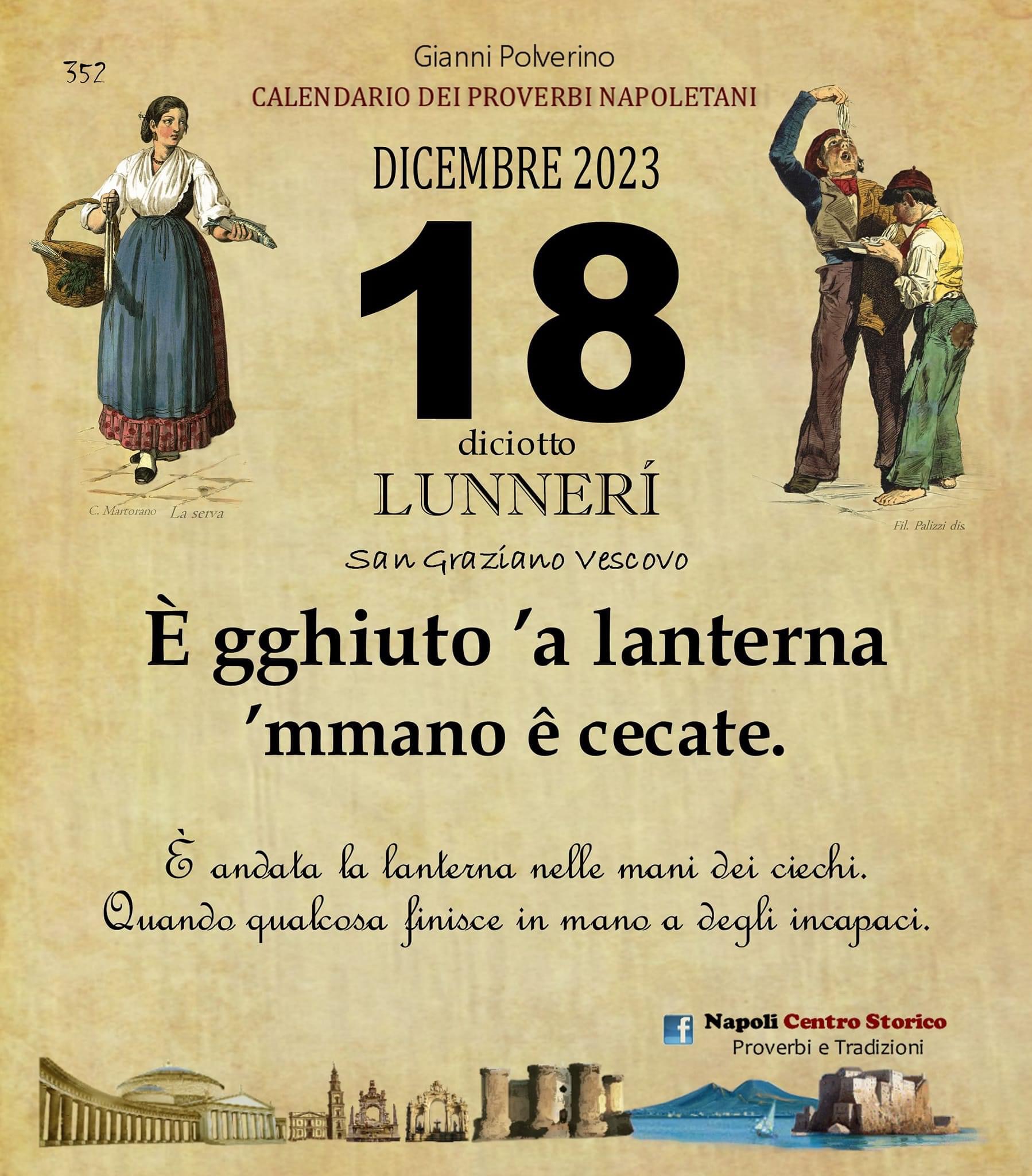 ‘O PRUVERBIO D’ ‘O JUORNO. Lunedì 18 dicembre 2023 18/12/2023 binews.it ATTUALITA', EVIDENZA, Il Proverbio del Giorno 0 di Gianni Polverino È gghiuto ’a lanterna ’mmano ê cecate. È andata la lanterna nelle mani dei ciechi. Quando qualcosa finisce in mano a degli incapaci.