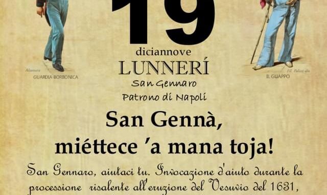 San Gennaro, aiutaci tu. Invocazione d’aiuto durante la processione risalente  all’eruzione del Vesuvio del 1631, e per miracolo la lava si fermò alle porte della città.