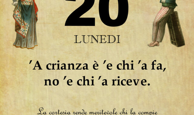 ‘O PRUVERBIO D’ ‘O JUORNO. Lunedì 20 luglio 2020 20/07/2020 binews.it ATTUALITA', EVIDENZA, Il Proverbio del Giorno 0 di Gianni Polverino ’A crianza è ’e chi ’a fa, no ’e chi ’a riceve. La cortesia rende meritevole chi la compie e non chi la riceve.
