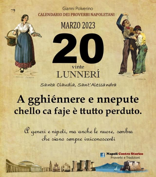 ‘O PRUVERBIO D’ ‘O JUORNO. Lunedì 20 marzo 2023 20/03/2023 binews.it ATTUALITA', EVIDENZA, Il Proverbio del Giorno 0 di Gianni Polverino A gghiénnere e nnepute chello ca faje è ttutto perduto. A generi e nipoti, ma anche le nuore, sembra che siano sempre irriconoscenti