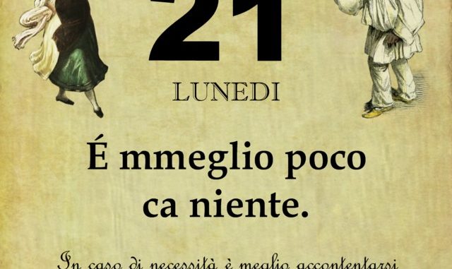 ‘O PRUVERBIO D’ ‘O JUORNO. Lunedì 21 gennaio 2019 21/01/2019 binews.it ATTUALITA', EVIDENZA, Il Proverbio del Giorno 0 di Gianni Polverino É mmeglio poco ca niente. In caso di necessità è meglio accontentarsi del poco che non avere nulla.