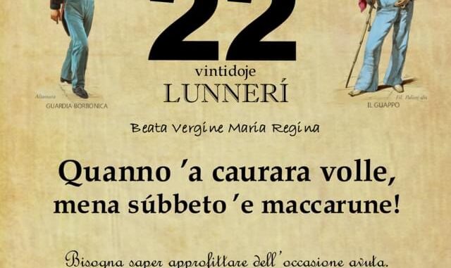 ‘O PRUVERBIO D’ ‘O JUORNO. Lunedì 22 agosto 2022 22/08/2022 binews.it ATTUALITA', EVIDENZA, Il Proverbio del Giorno 0 di Gianni Polverino Quanno ’a caurara volle, mena súbbeto ’e maccarune! Bisogna saper approfittare dell’occasione avuta.