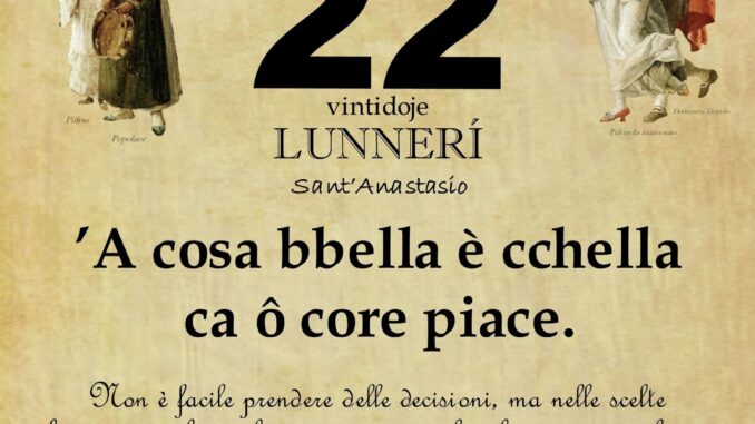 ‘O PRUVERBIO D’ ‘O JUORNO. Lunedì 22 gennaio 2024 22/01/2024 binews.it ATTUALITA', EVIDENZA, Il Proverbio del Giorno 0 di Gianni Polverino ’A cosa bbella è cchella ca ô core piace. Non è facile prendere delle decisioni, ma nelle scelte bisogna ascoltare il proprio cuore, è lui il primo consigliere.