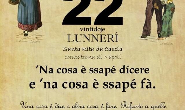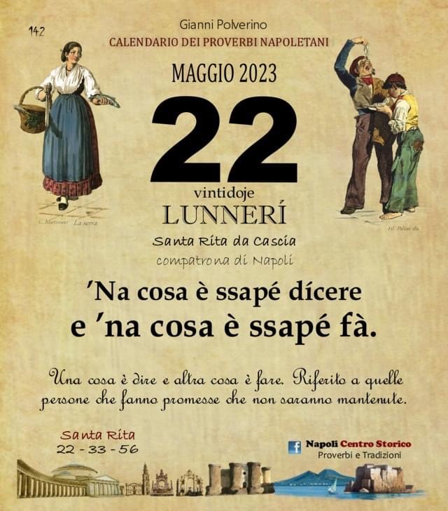 ‘O PRUVERBIO D’ ‘O JUORNO. Lunedì 22 maggio 2023 22/05/2023 binews.it ATTUALITA', EVIDENZA, Il Proverbio del Giorno 0 di Gianni Polverino ’Na cosa è ssapé dícere e ’na cosa è ssapé fà. Una cosa è dire e altra cosa è fare. Riferito a quelle persone che fanno promesse che non saranno mantenute.