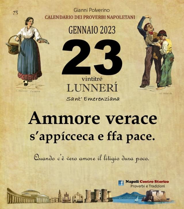 ‘O PRUVERBIO D’ ‘O JUORNO. Lunedì 23 gennaio 2023 23/01/2023 binews.it ATTUALITA', EVIDENZA, Il Proverbio del Giorno 0 di Gianni Polverino Ammore verace s’appícceca e ffa pace. Quando c’è vero amore il litigio dura poco.