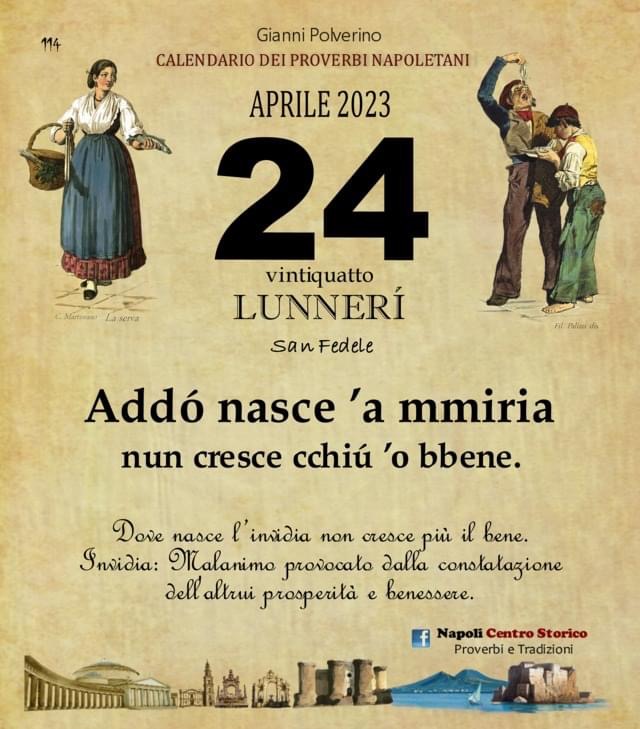 ‘O PRUVERBIO D’ ‘O JUORNO. Lunedì 24 aprile 2023 24/04/2023 binews.it ATTUALITA', EVIDENZA, Il Proverbio del Giorno 0 di Gianni Polverino Addó nasce ’a mmiria nun cresce cchiú ’o bbene. Dove nasce l’invidia non cresce più il bene. Invidia: Malanimo provocato dalla constatazione dell’altrui prosperità e benessere.