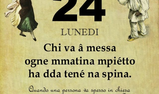 ‘O PRUVERBIO D’ ‘O JUORNO. Lunedì 24 giugno 2019 24/06/2019 binews.it ATTUALITA', EVIDENZA, Il Proverbio del Giorno 0 di Gianni Polverino Chi va â messa ogne mmatina mpiétto ha dda tené na spina. Quando una persona va spesso in chiesa sicuramente avrà qualcosa da chiedere al Signore o farsi perdonare qualche peccato.